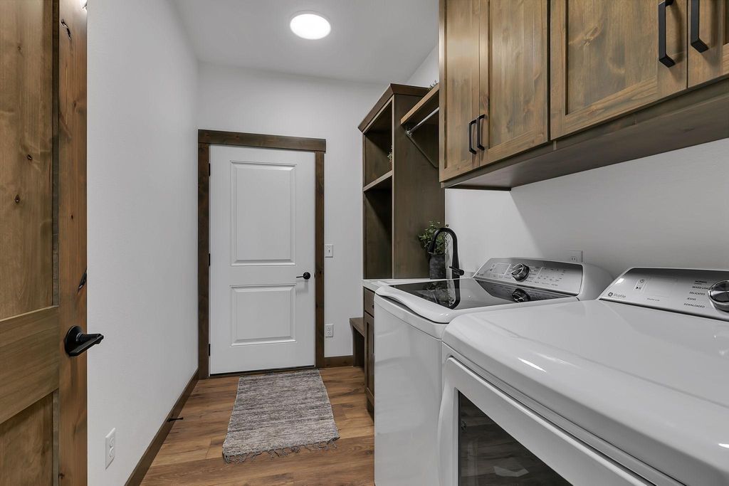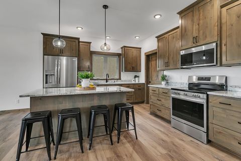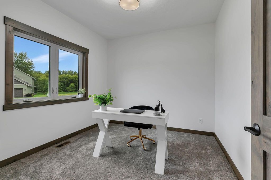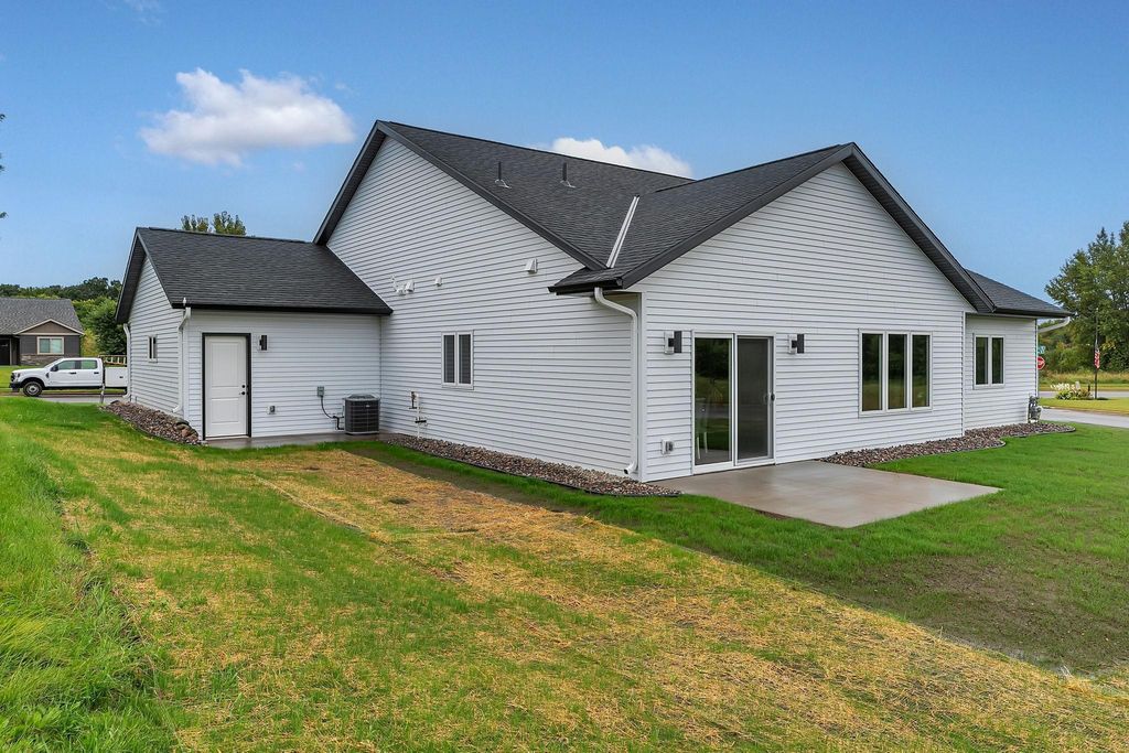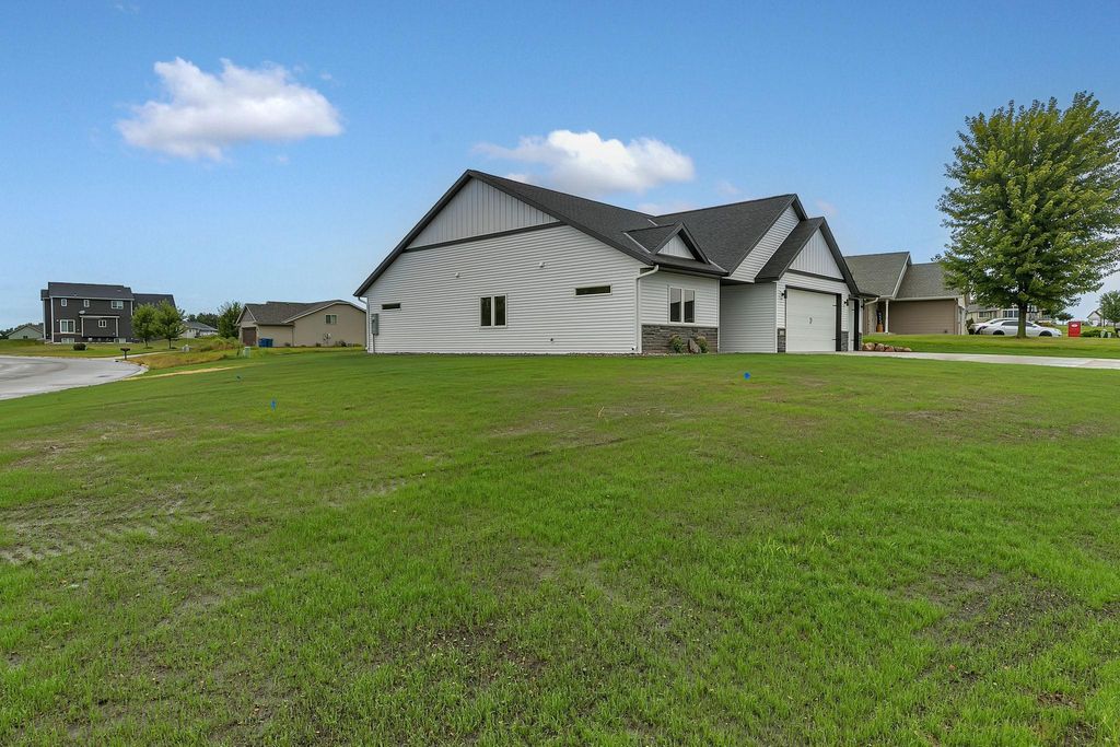 Be the first to own this beautifully crafted new construction patio home featuring 3 bedrooms, 2 bathrooms, and a spacious 3-stall insulated garage (35' x 26') with floor drain. Step onto the front porch and enter an open-concept floor plan with 9-foot ceilings and durable vinyl plank flooring throughout. The kitchen is a showstopper with custom-stained knotty alder cabinetry, a large center island, granite countertops, stainless steel appliances, and a walk-in pantry with countertop that doubles as a built-in safe room. The adjoining dining area opens to a concrete back patio - perfect for indoor/outdoor entertaining. Relax in the inviting living room centered around a stunning electric fireplace with stone surround. A full second bathroom offers convenience for guests. The spacious owner's suite is a true retreat, featuring a private en-suite with a roll-in tiled shower, custom dual-sink vanity, and a large walk-in closet. The laundry room is fully equipped with a sink, cabinetry, and washer/dryer. Exterior highlights include steel siding with stone accents, a concrete driveway, in-ground sprinkler system, and a seeded/landscaped yard. This home combines high-end finishes with functional design - schedule your showing today!