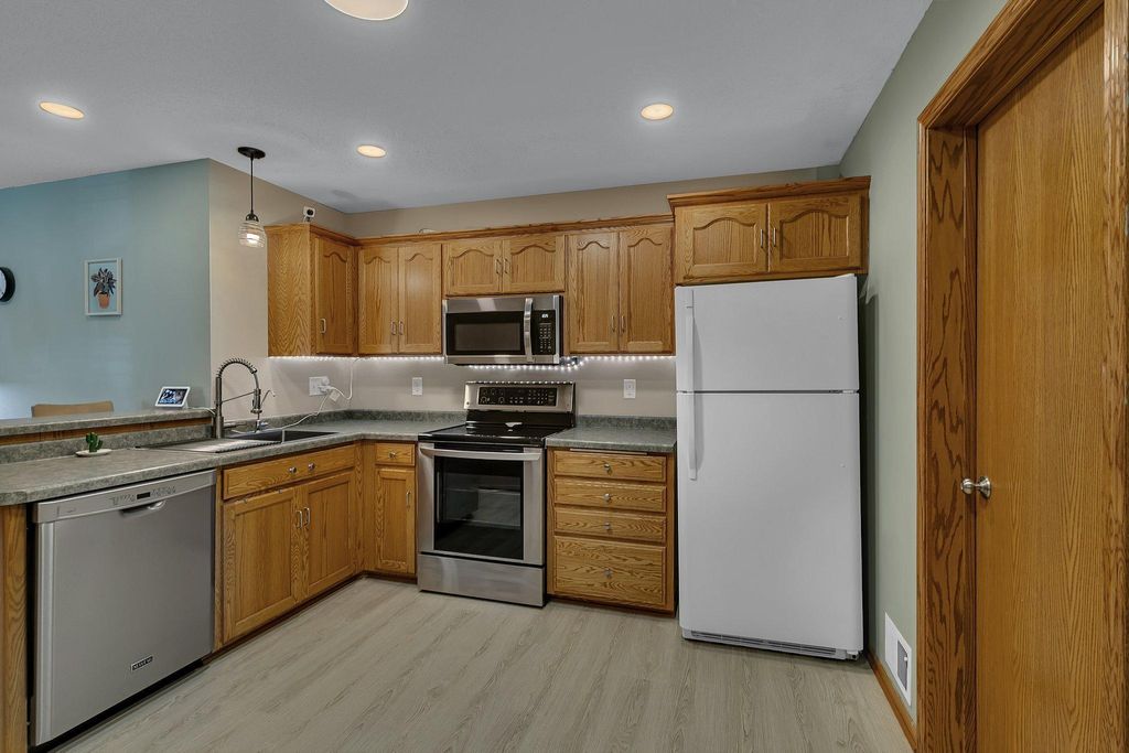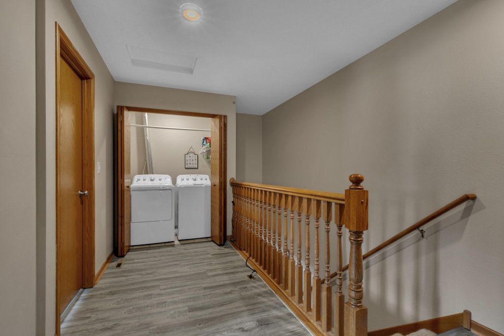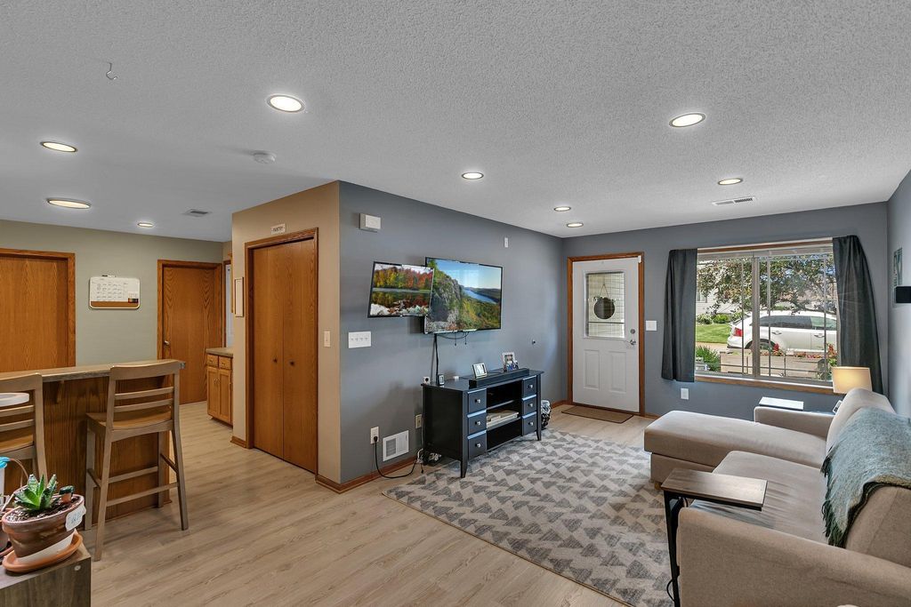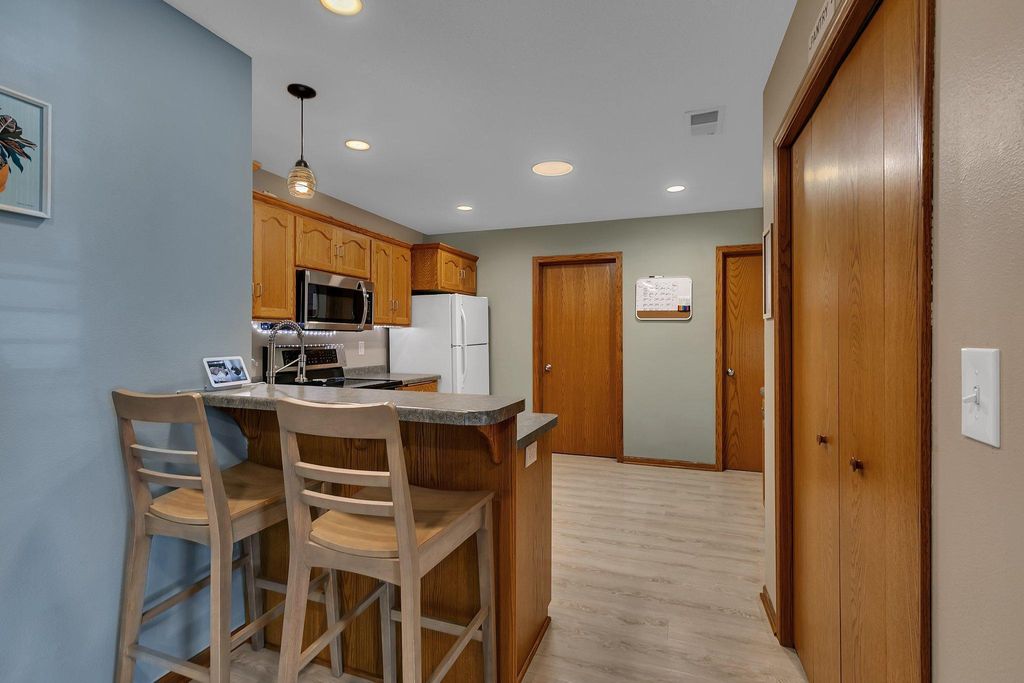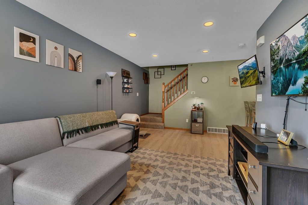 Own this low maintenance townhome; featuring a 2-stall insulated garage, 3 bedrooms & laundry on the same level & new roof! Appreciate having lawn care & snow removal w/lower monthly dues. Drive up to the cozy front patio and newly sealed asphalt driveway. Kitchen features SS appliance, eat-in counter, coffee bar & vinyl planking flooring. Steps from the kitchen is the convenient half bath. Living room is spacious; perfect for entertaining guests. Upper lever features 3 bedrooms and the laundry room. Primary bedroom is large with a walk-in closet. Enjoy having a walk-through full bath connected to your bedroom. Updates include: recessed lighting, water softener, microwave & more. You will love this peaceful setting with walking trails; located in a wonderful community. Book your showing today!